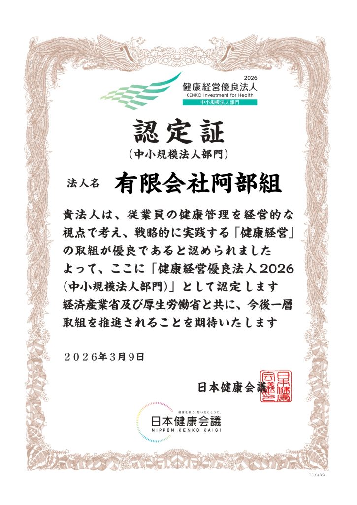 2026年3月9日、日本健康会議 様より弊社の健康経営の取組みについて、健康経営優良法人2026(中小規模法人部門)の認定をいただきました。(健康経営優良法人認定制度についてはこちら